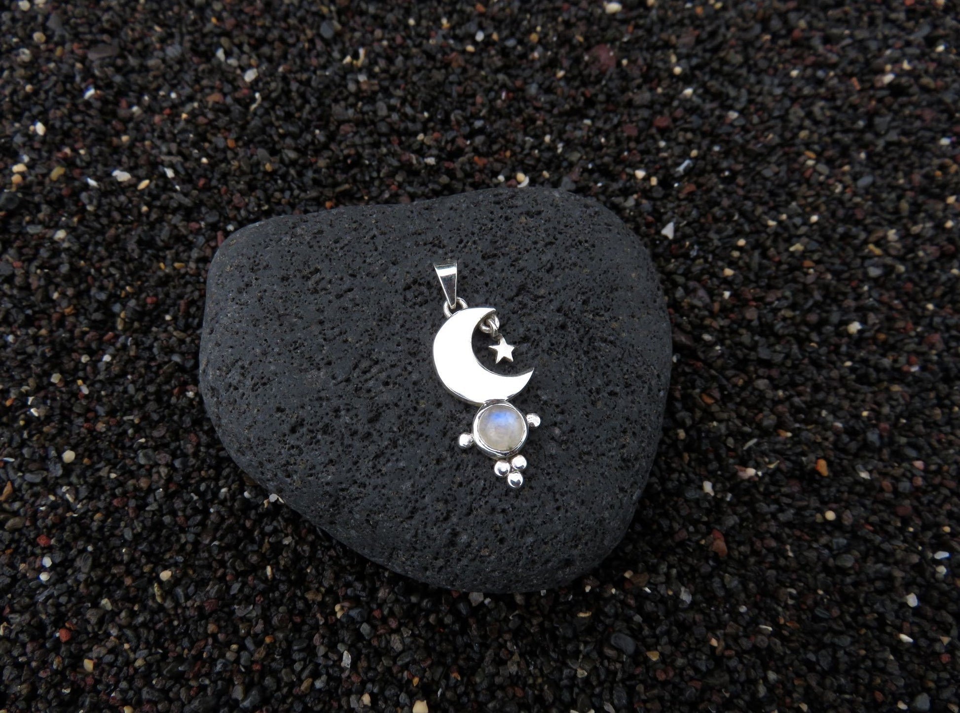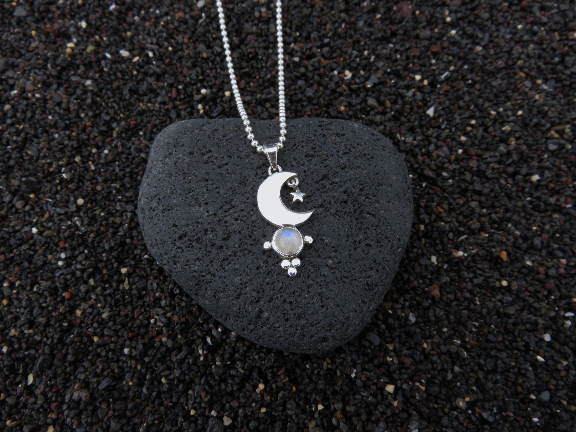 small pendant with moon, rainbow moonstone and small dangling star on a ball chain
