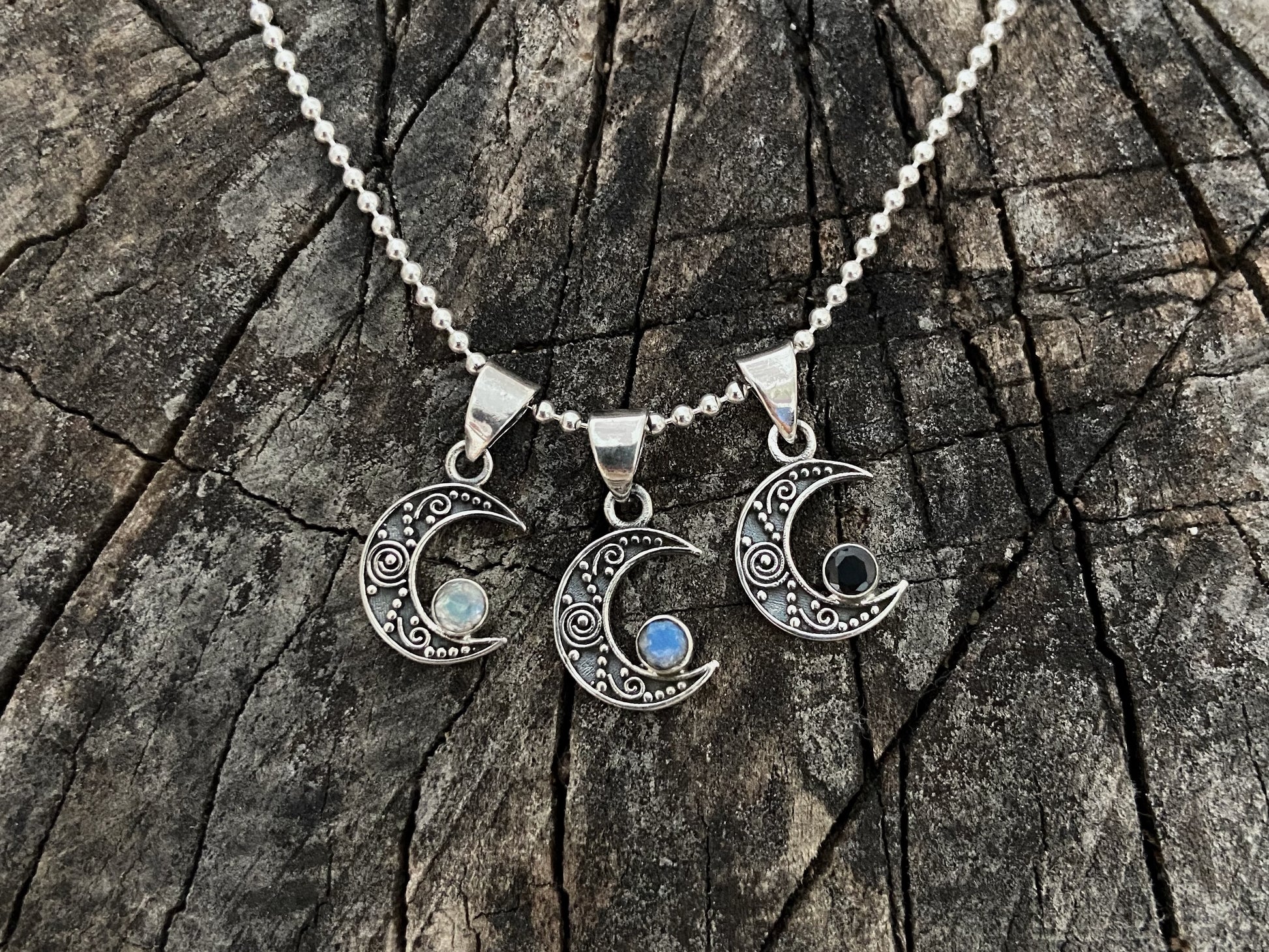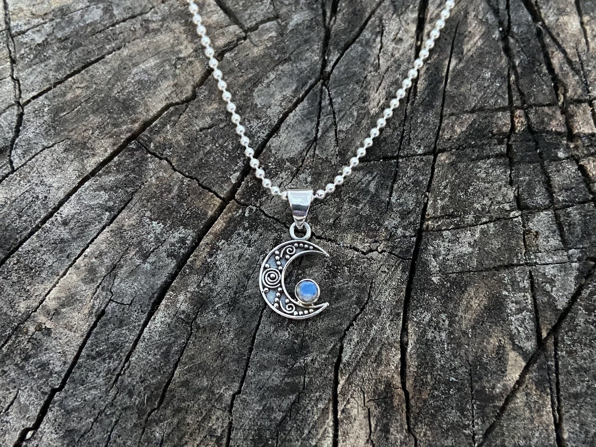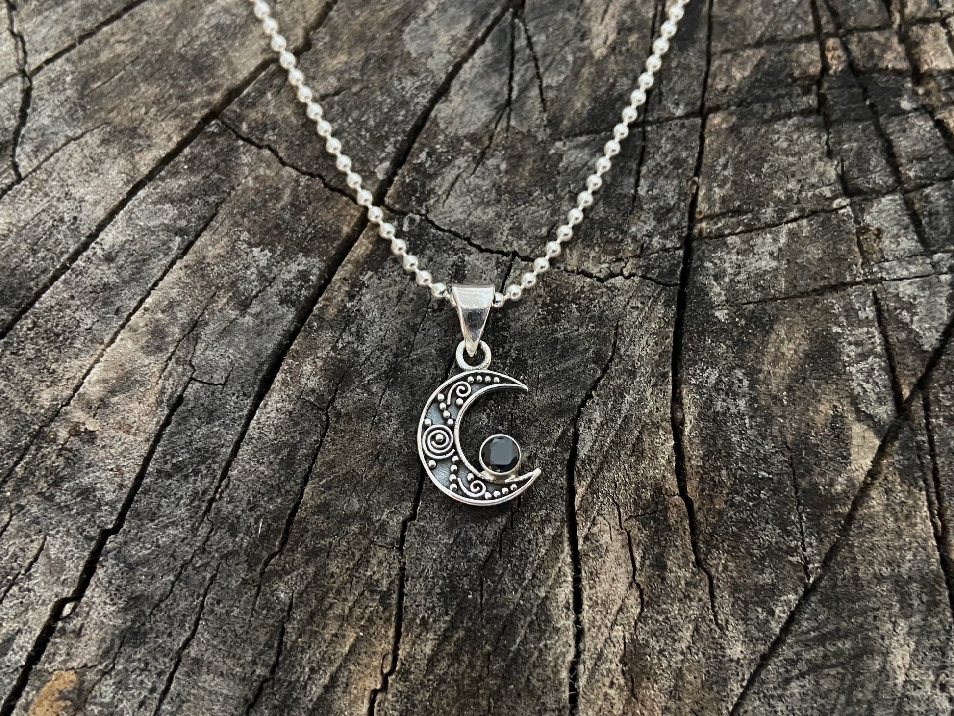 kleiner Mond Anhänger mit Kügelchen Muster und Stein aus Silber, Mondsichel