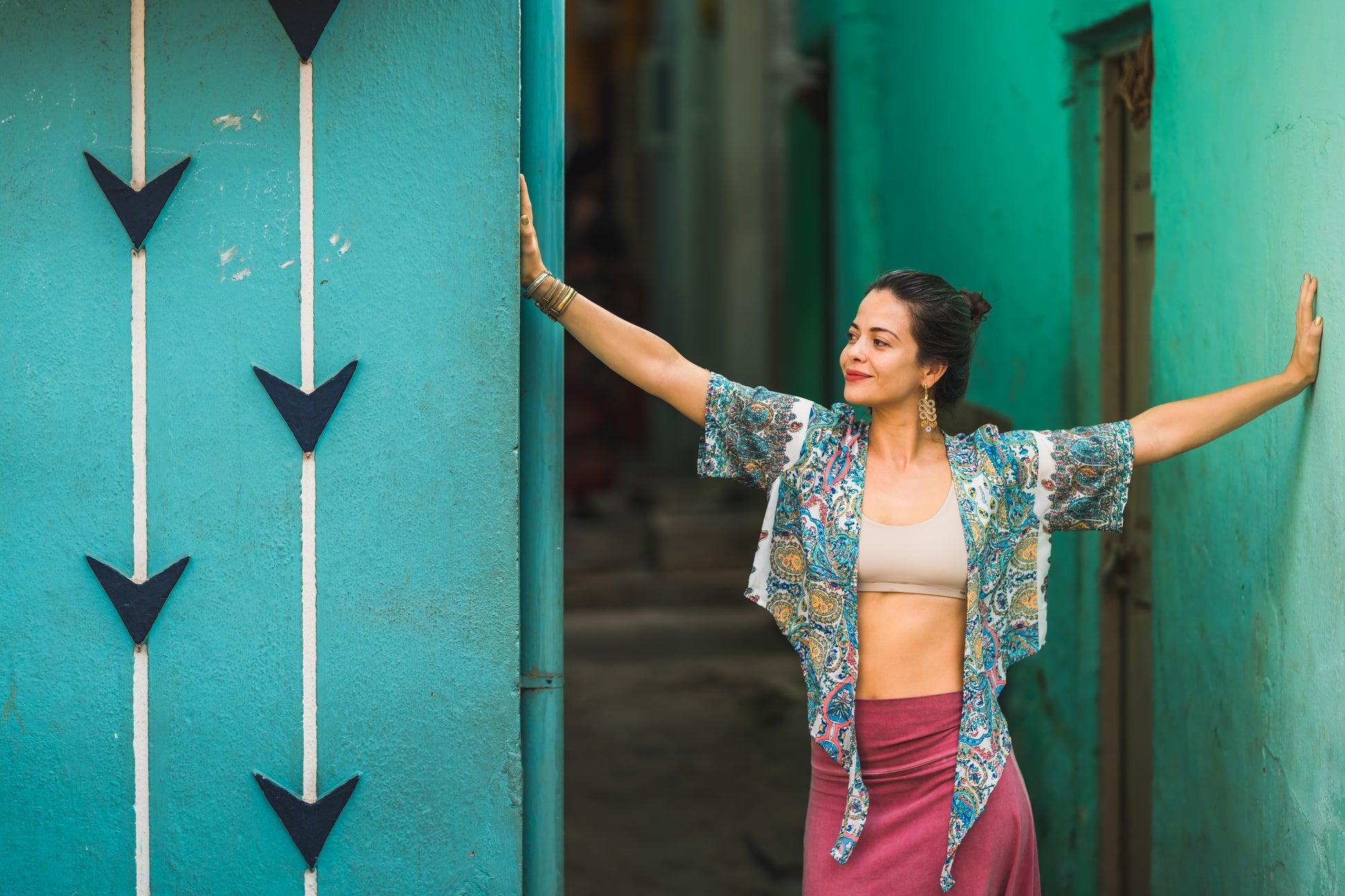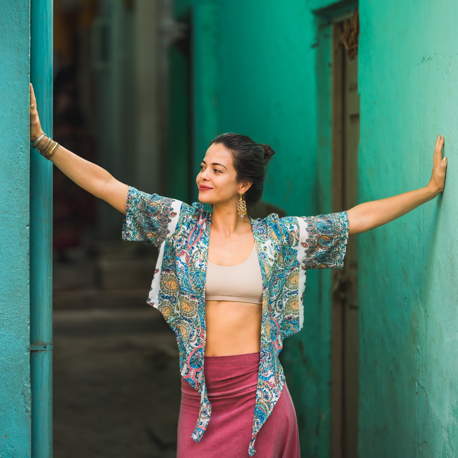 Der Kimono kann offen oder vorne zusammengebunden getragen werden.