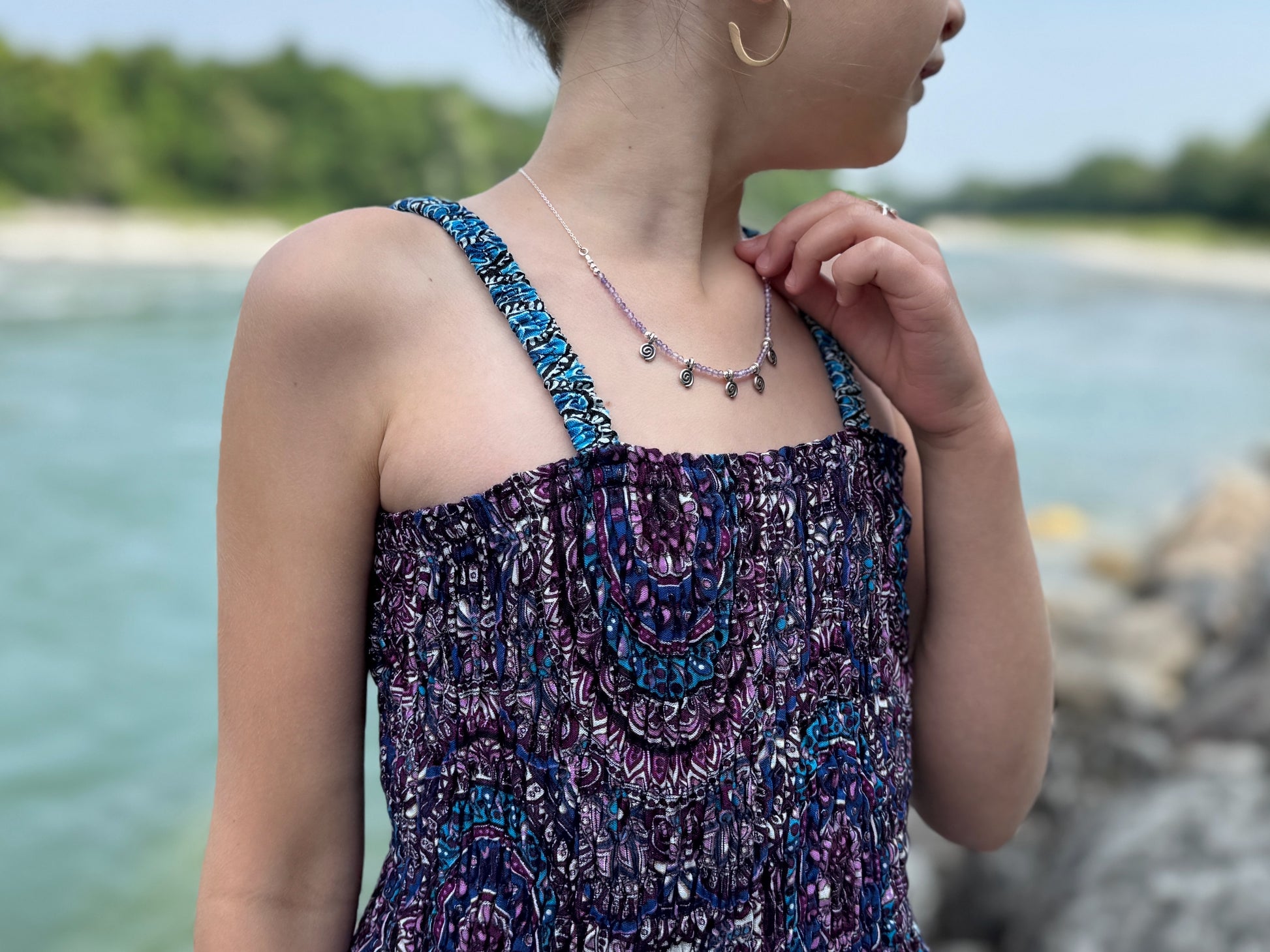 Dieses leichte, rosa blau gemusterte Kleid ist ideal für warme Tage. Mit seinen verspielten Zipfeln und Fransen im Elfenstil verbindet es Komfort mit einem Hauch von Fantasie – perfekt für Alltag, Urlaub oder Festival.