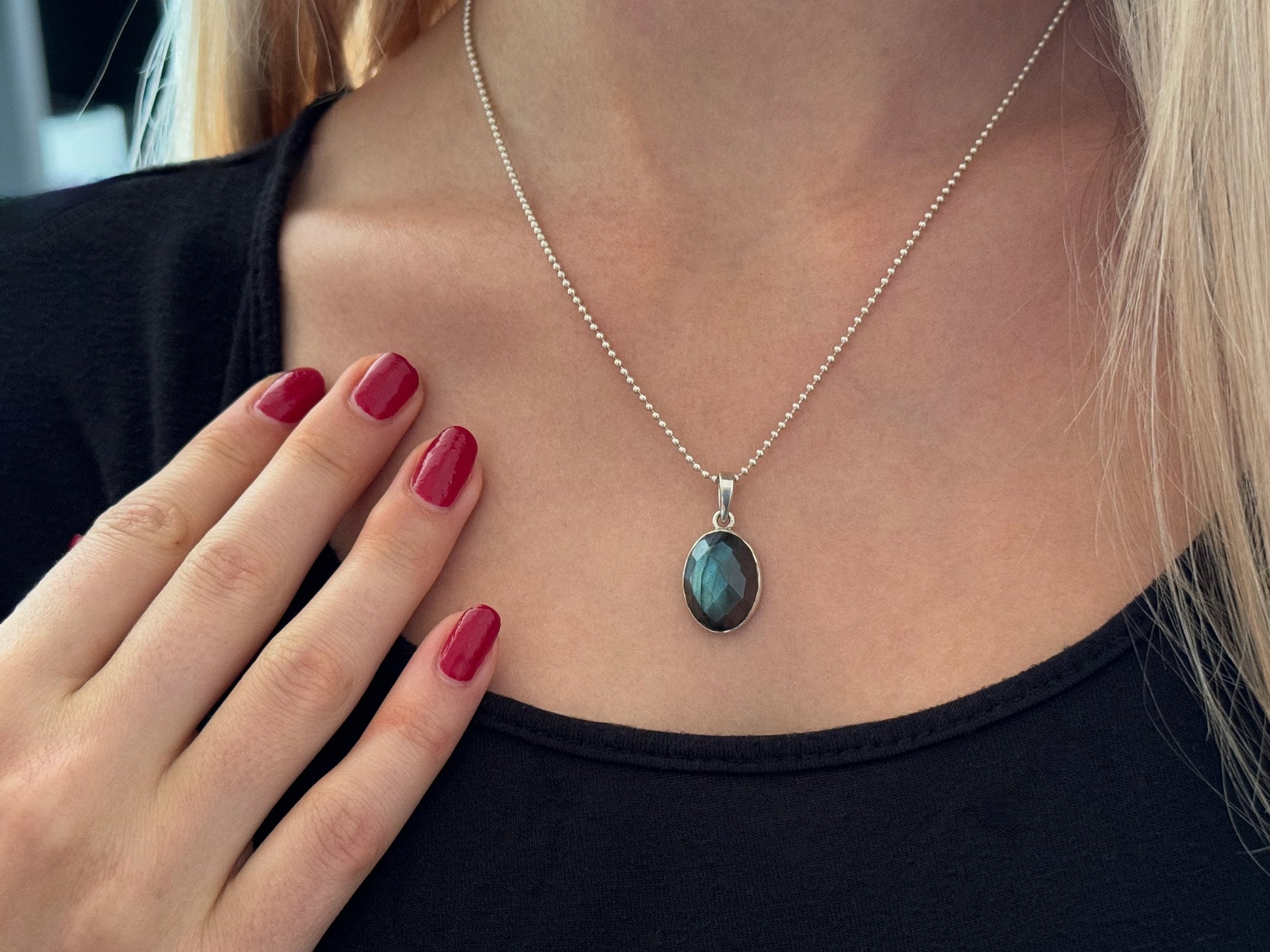 ovaler Anhänger mit facettiertem Labradorit Stein aus Silber