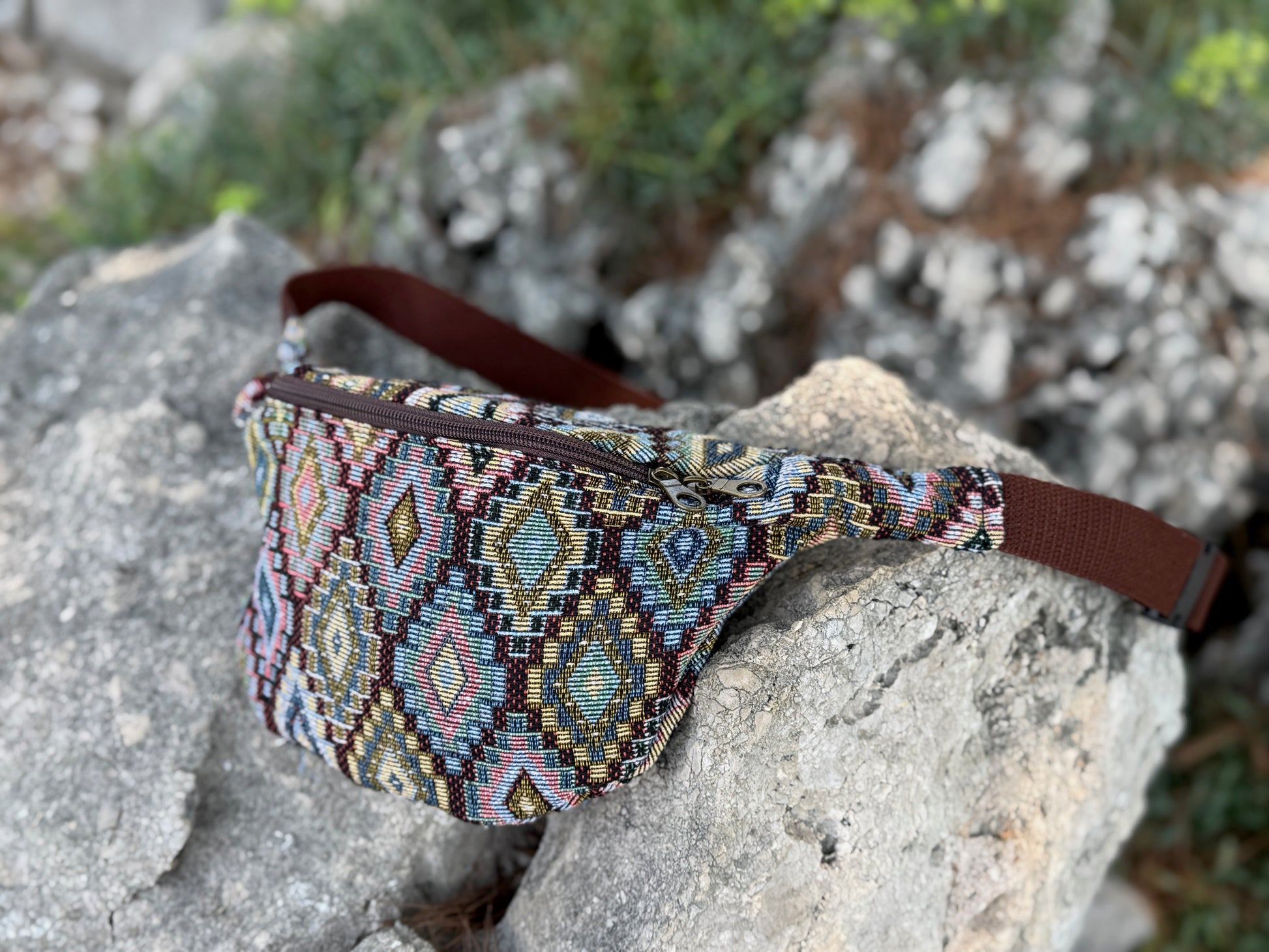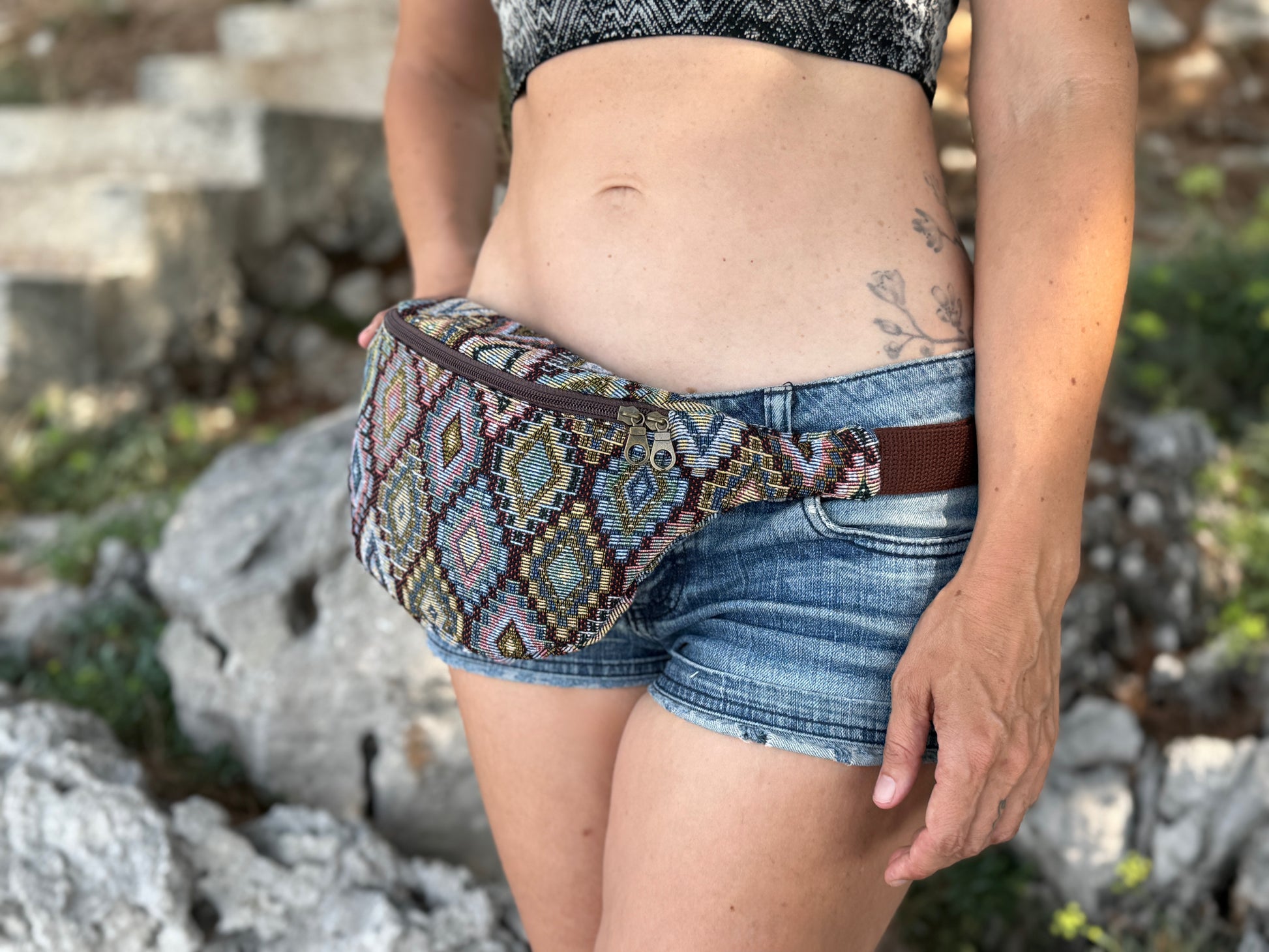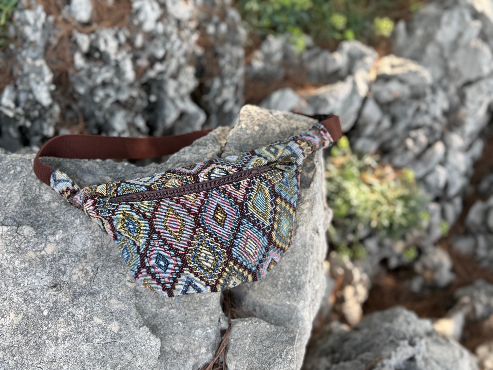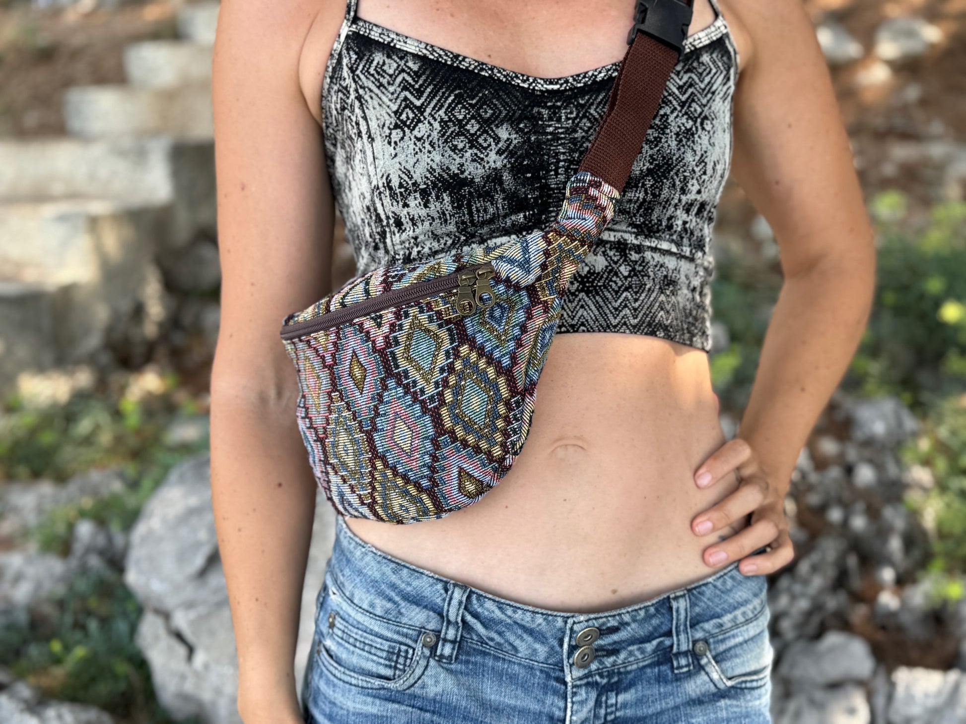 praktische Bauchtasche mit Reißverschluss und geometrischem Muster in braun rosa blau olive