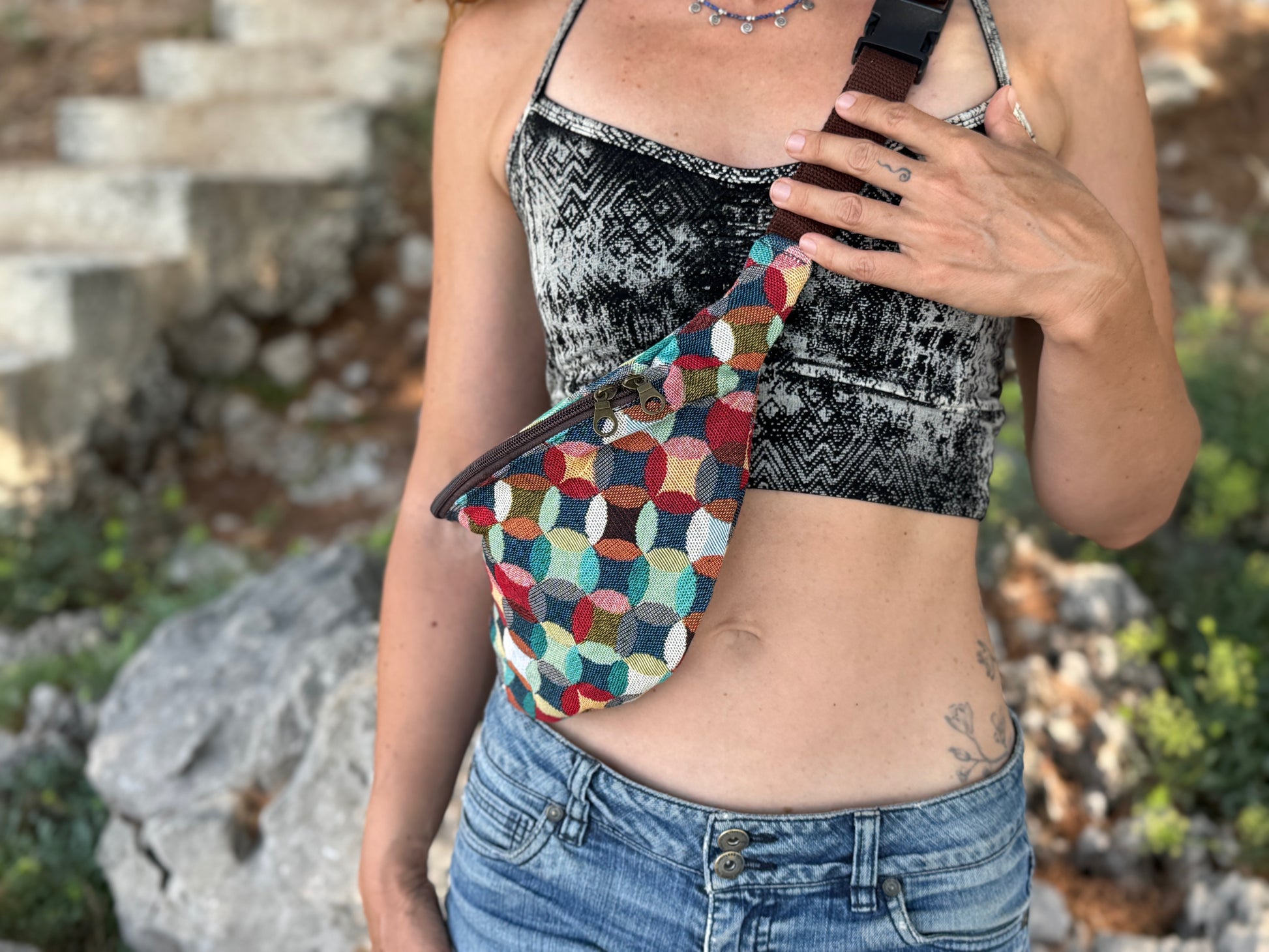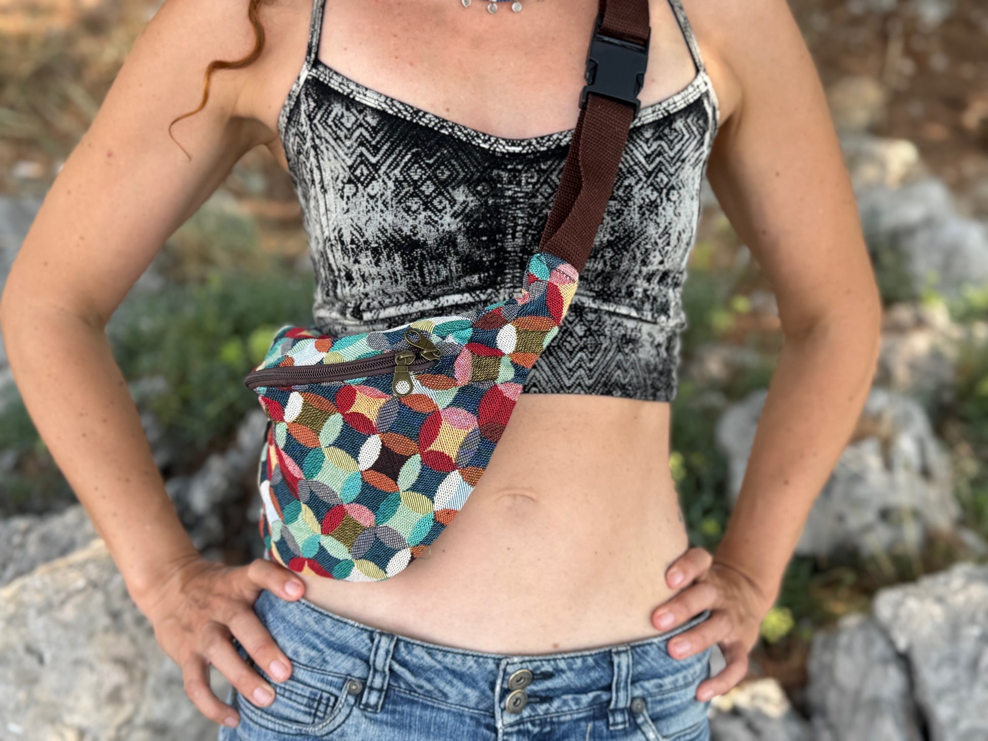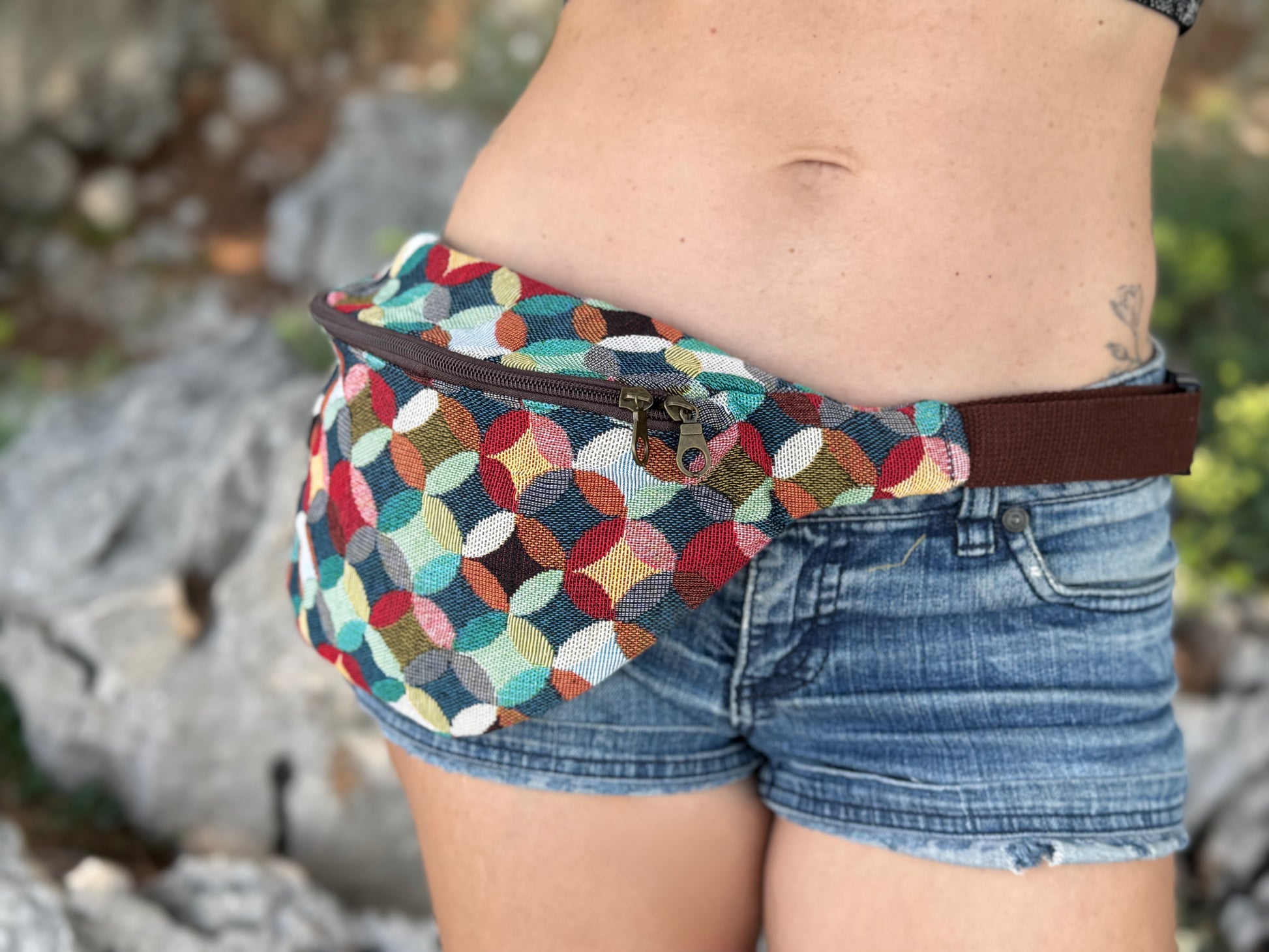 praktische Bauchtasche mit Reißverschluss und kreisförmigem buntem Muster