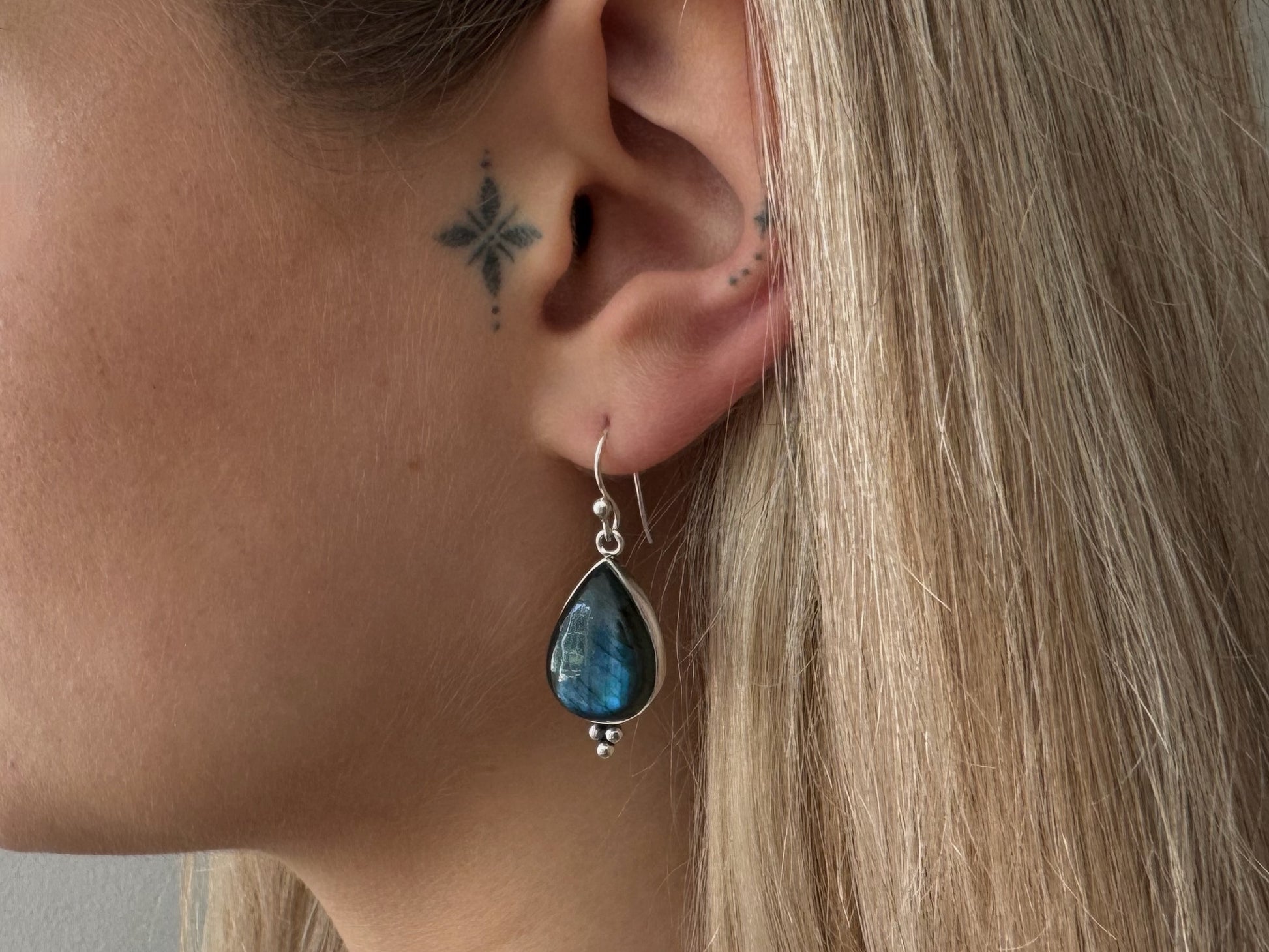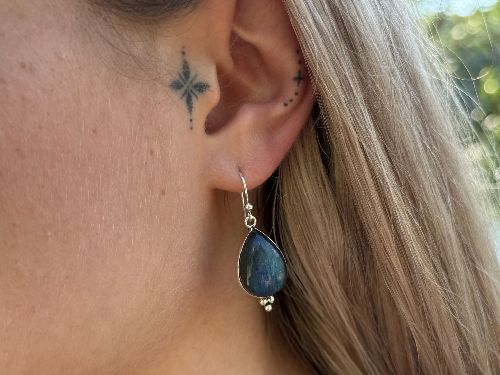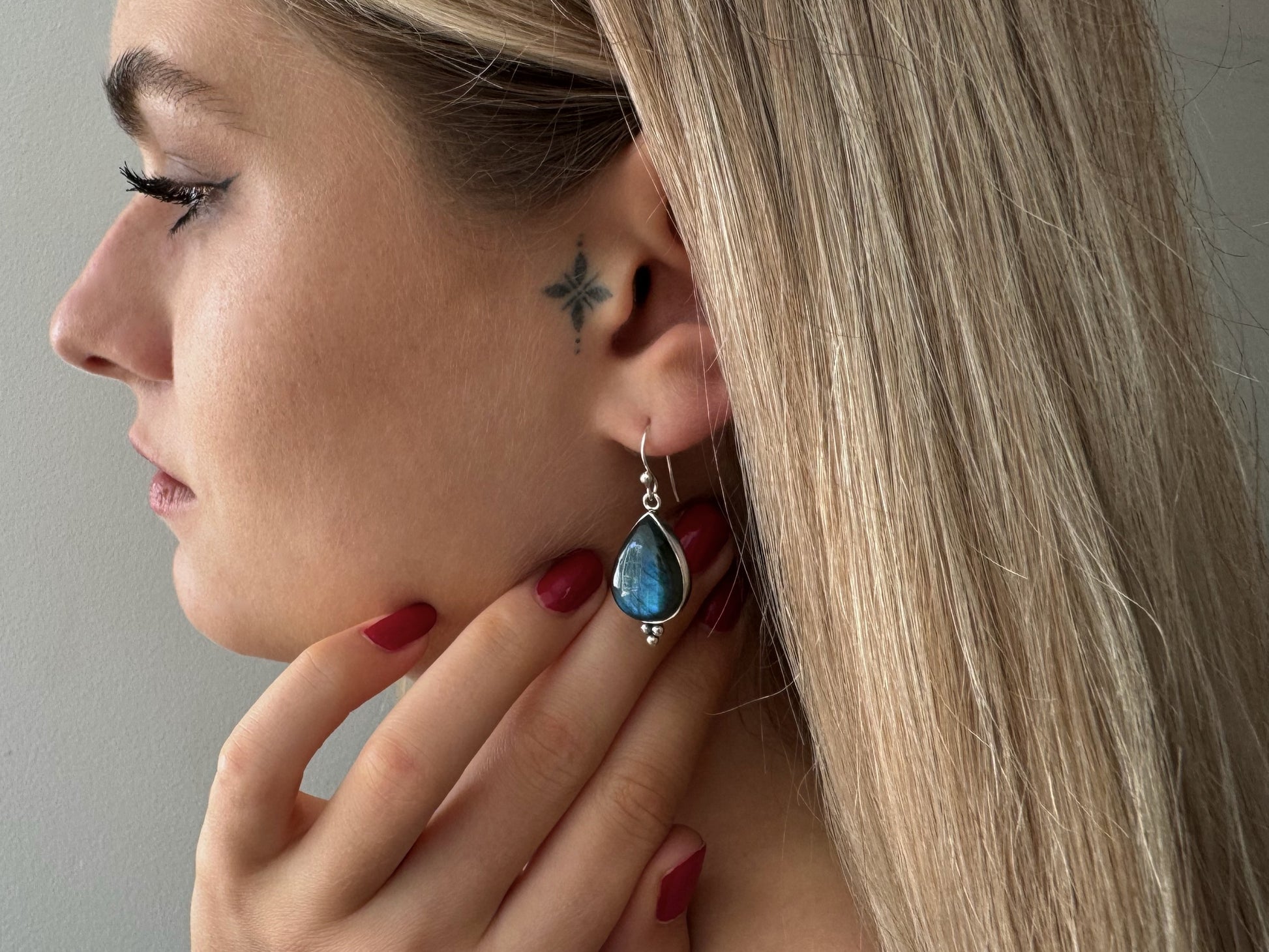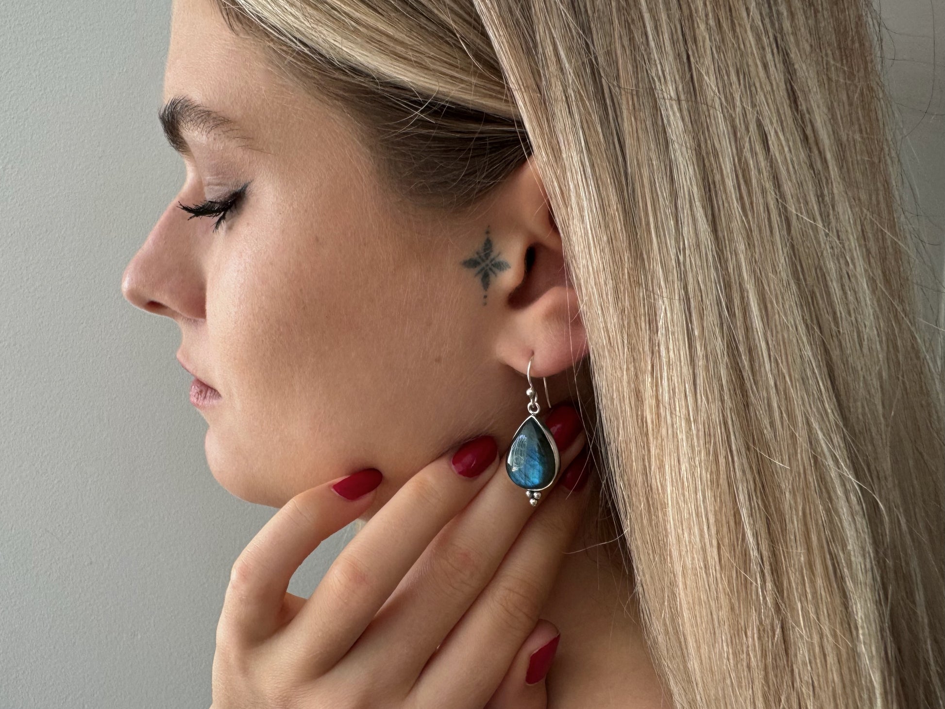 schlichte hängende Ohrringe mit Labradorit in Tropfenform