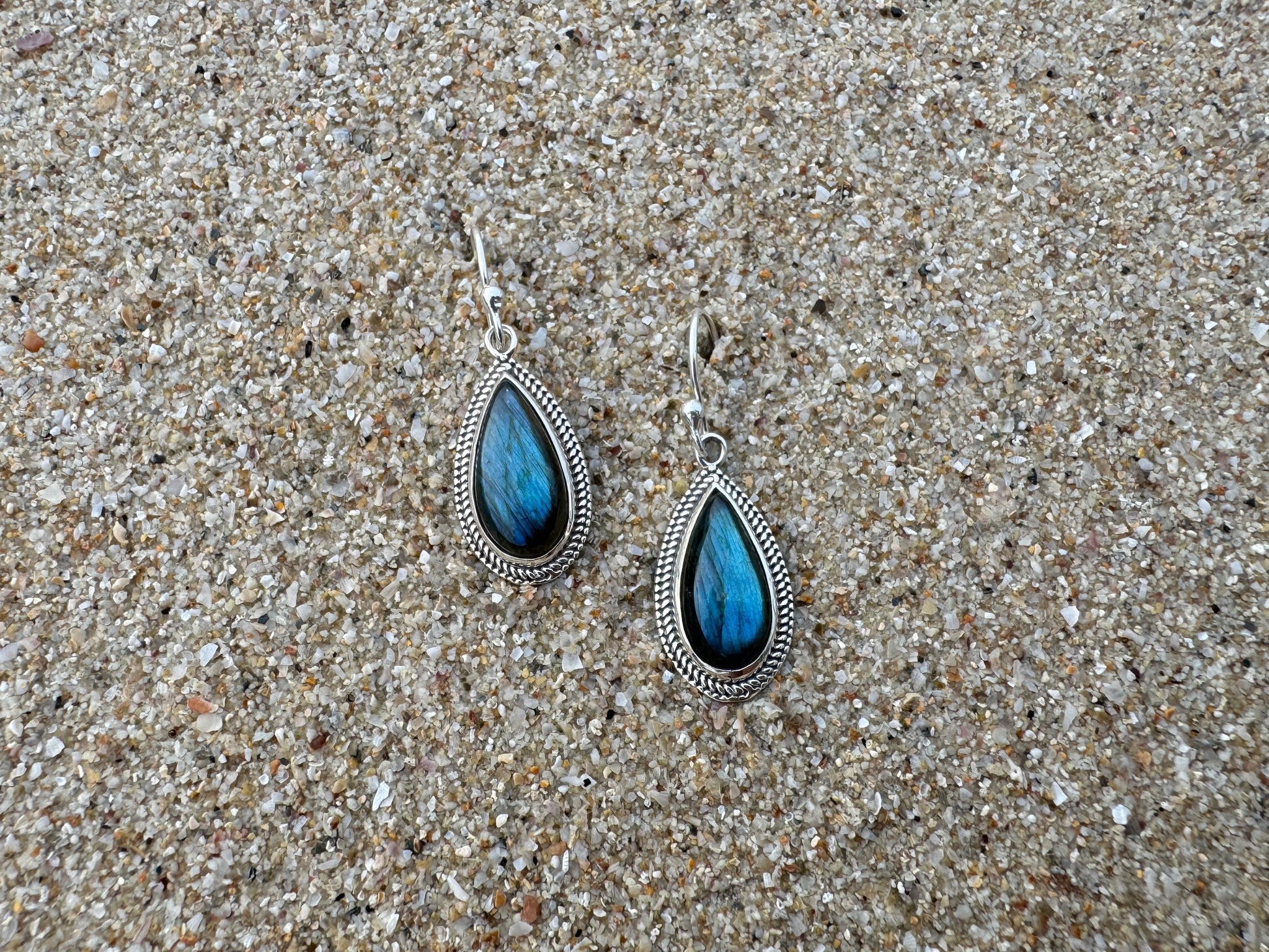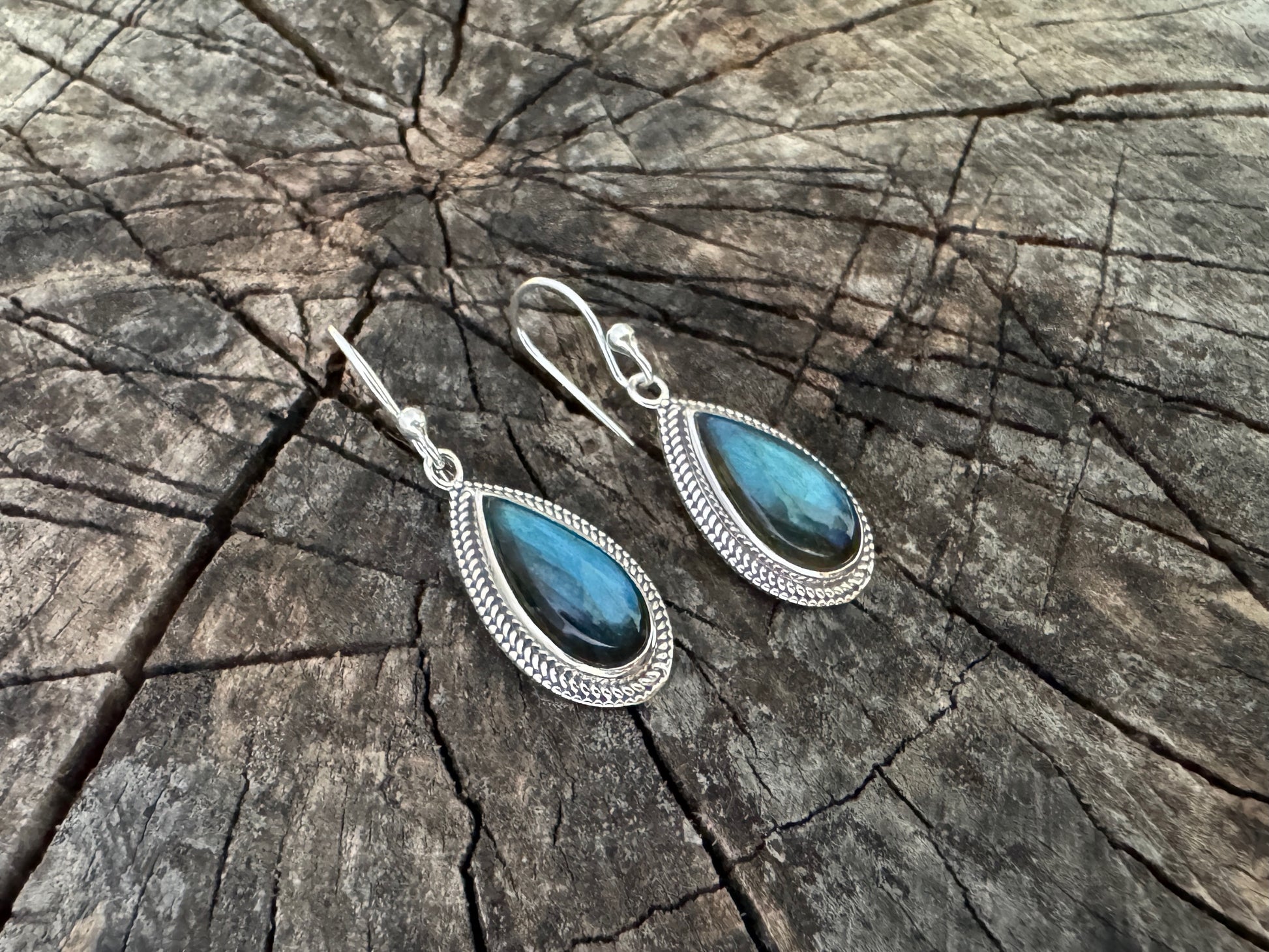schlichte tropfenförmige Hängeohrringe mit Labradorit und gemustertem Rand