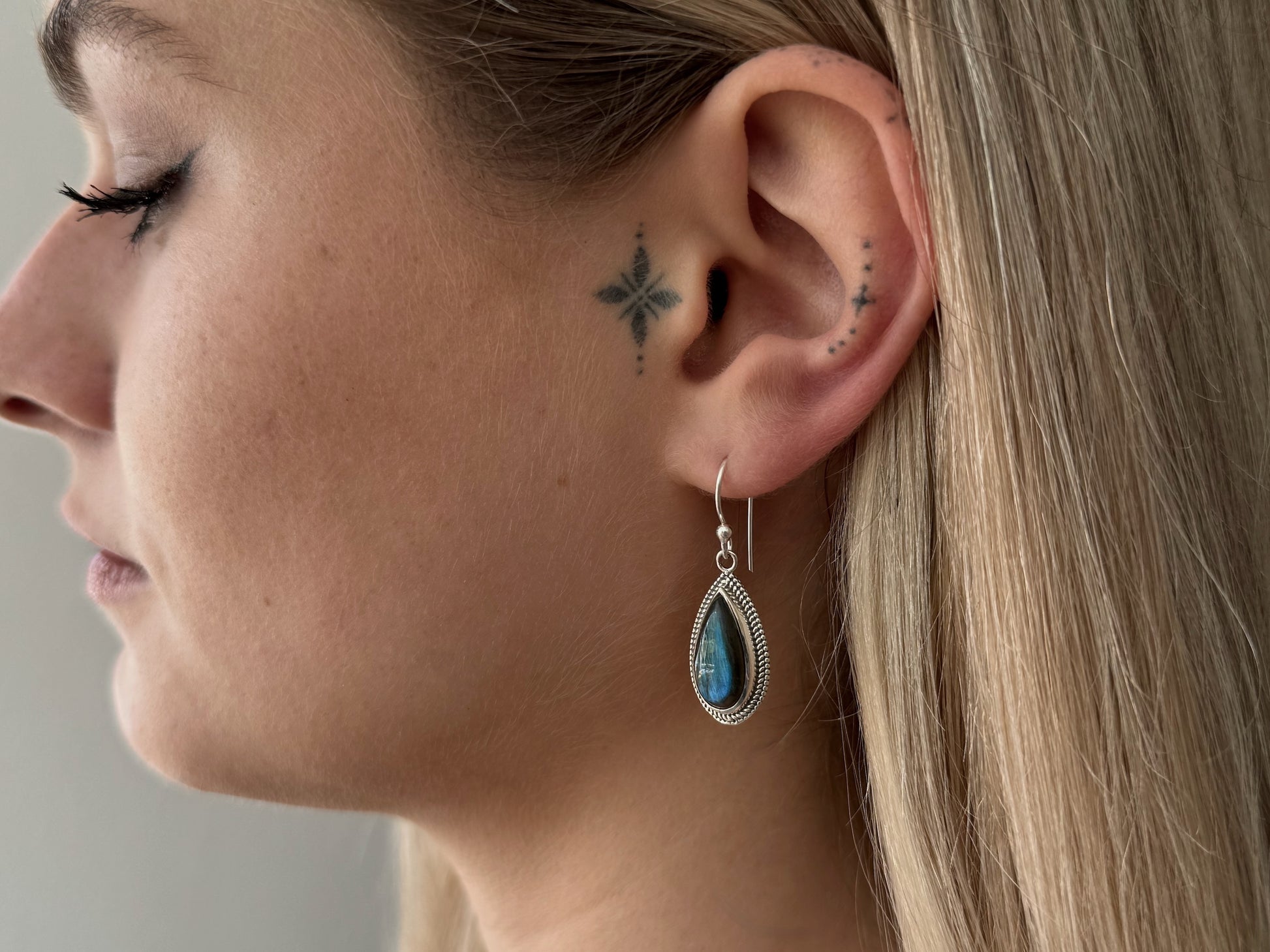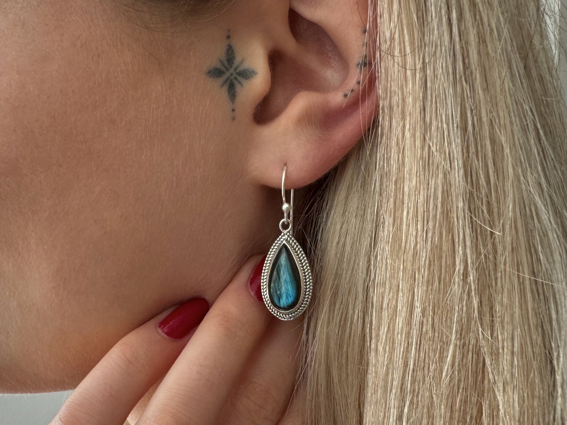 schlichte hängende Ohrringe mit Labradorit in Tropfenform und gemustertem Rand