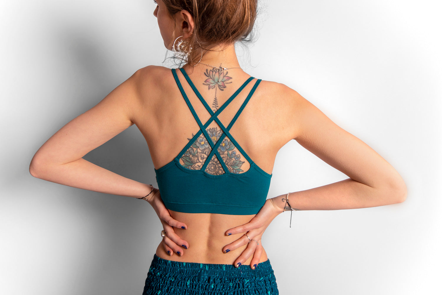 Yoga top with detailed back pattern, printed with the flower of life pattern, turquoise/black